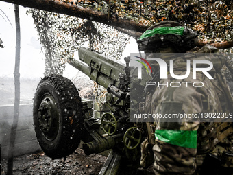 A soldier from an artillery crew of the Striletskyi special forces police battalion of the Main Department of the National Police in Zaporizhzhia region stands by a 122-mm howitzer D-30 to fire at the positions of Russian troops in the Pokrovsk direction in Donetsk region, Ukraine, on November 20, 2025.