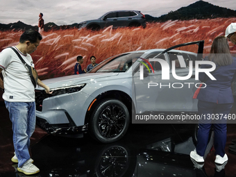 Visitors inspect a HONDA CR-V e:HEV car displayed at the 42nd Thailand International Motor Expo 2025 in Bangkok, Thailand, on November 29, 2025. The event is one of Thailand's largest international motor shows and runs until December 10, 2025.