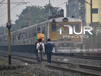 A suburban train moves towards a station on a smoggy day in Kolkata, India, on November 23, 2025.