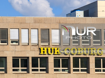 The HUK-Coburg office building has its logo on the facade in Munich, Bavaria, Germany, on October 1, 2025. HUK-Coburg is a German insurance company that offers a wide range of insurance services.