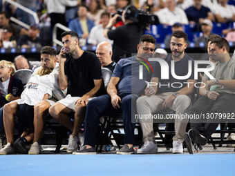 Spanish former soccer players Jordi Alba, Sergio Busquets, and Ronaldo from Brazil attend the Miami Invitational at loanDepot Park in Miami, Florida, on December 8, 2025.
