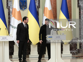 President of Ukraine Volodymyr Zelenskyy and President of Cyprus Nikos Christodoulides, who arrives on an official visit, give a joint press conference following their meeting, where they discuss Cyprus's upcoming Presidency of the Council of the EU in the first half of 2026 and peace efforts to end the Russian-Ukrainian war, in Kyiv, Ukraine, on December 4, 2025.