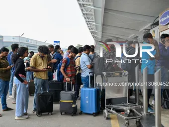 Passengers wait in line at an IndiGo Airlines counter at Chennai International Airport in Chennai, India, on December 4, 2025.