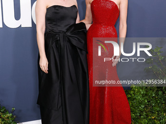Norwegian actress Inga Ibsdotter Lilleaas and Norwegian actress Renate Reinsve wearing a Schiaparelli FW25 Couture gown arrive at the Los Angeles Premiere Of Neon's 'Sentimental Value' held at the DGA Theater Complex at The Directors Guild of America in Los Angeles, California, United States.