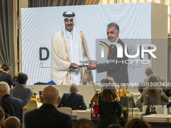 Emir of Qatar Sheikh Tamim bin Hamad Al-Thani presents the Doha Forum Award to Saad Mohseni and Alex Thier in recognition of their transformative work in challenging environments such as Palestine and Afghanistan, where they work to provide access to education for children at the opening session of the Doha Forum 2025 at the Sheraton Grand Doha Resort & Convention Hotel in Doha, Qatar, on December 6, 2025.