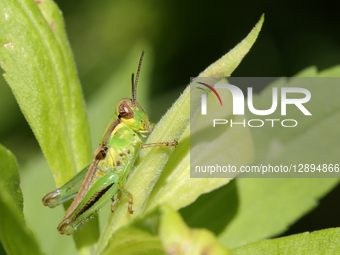 A Red-legged Grasshopper (Melanoplus femurrubrum) nymph is on a leaf in Markham, Ontario, Canada, on July 3, 2025.