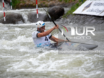 LA SEU D'URGELL, SPAIN - SEPTEMBER 02: Giovanni DE GENNARO of Italy competes in the Men's Finals during the 2023 ICF Men's Canoe Slalom World Cup on September 02, 2023 in La Seu d'Urgell, Spain.