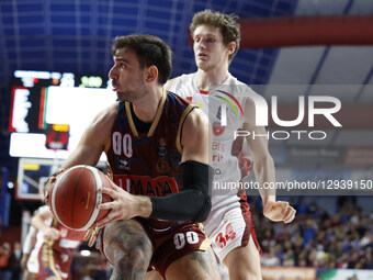 Amedeo Tessitori of Umana Reyer competes against Maximilian Ladurner of Openjobmetis Varese during the Italian LBA basketball championship match between Umana Reyer Venezia and Openjobmetis Varese at Taliercio in Venezia, Italy, on November 2, 2025.
