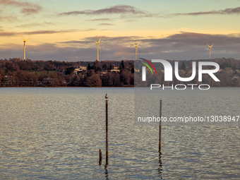 Four large white wind turbines stand on a ridge above the forested and residential shoreline of Lake Starnberg in Starnberg, Germany, on November 29, 2025, symbolizing green energy production against a colorful sunset sky. In the foreground, a seagull sits atop a wooden piling in the calm water of the lake.
