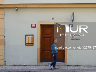 A man walks past the entrance of the Vaclav Havel Library in Prague, Czech Republic, on May 12, 2025. The institution preserves the legacy of Vaclav Havel, former president, dissident, and playwright, and is located in the historical center of the city.