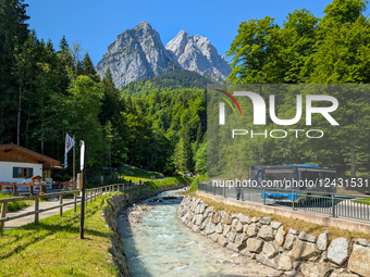 A regional Lake Eibsee bus stops at the Hammersbach halt in Grainau, Garmisch-Partenkirchen, Bavaria, Upper Bavaria, Germany, on May 31, 2025. Hammersbach serves as a starting point for hikers and mountaineers heading into the Wetterstein Mountains and is connected to Garmisch-Partenkirchen and the Eibsee via bus and cogwheel railway.