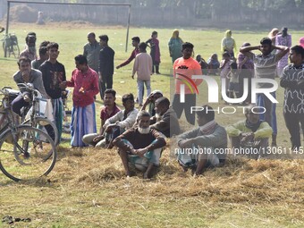 People take shelter on a field after the demolition of their houses by local authorities during an eviction drive at an alleged illegal residential settlement in Rupahi Bhakat Gaon, Nagaon District, Assam, India, on December 5, 2025.