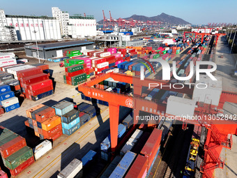 Large machinery loads containers onto the China-Europe freight train at the China Kazakhstan (Lianyungang) logistics cooperation base in Lianyungang, Jiangsu Province, China, on December 3, 2025.
