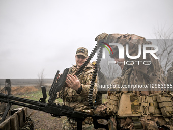 Fighters of the Separate Anti-Aircraft Machine Gun Battalion, who are providing air cover for unmanned aerial vehicles and destroying targets at a distance of up to 1,500 meters, are seen during shooting practice with a Browning heavy machine gun in Zaporizhzhia region, southeastern Ukraine, on July 10, 2024. NO USE RUSSIA. NO USE BELARUS.