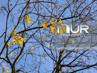Bare tree branches with only a few remaining bright yellow autumn leaves frame a clear blue sky with a contrail. The view looks up in Munich, Bavaria, Germany, on November 12, 2025.