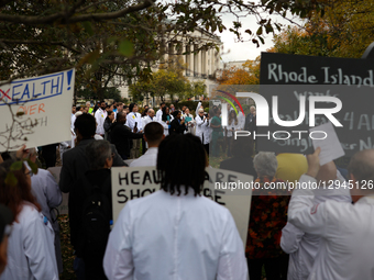 Medical professionals and patients gather for a march and rally outside of the U.S. Capitol in Washington, D.C. on November 3, 2025, demanding an end to health care policies which they say are harming communities and threatening care access for low-income families, people with disabilities and the elderly. The demonstration, organized by Physicians for a National Health Program (PNHP), drew roughly 200 people calling for Medicare for everyone in the U.S.