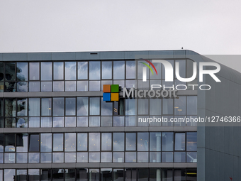 The front of the Microsoft Germany office is seen with its modern glass facade and iconic logo sign in Munich, Bavaria, Germany, on January 23, 2022.