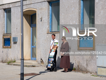 Two Jehovah's Witnesses stand next to a literature cart offering religious publications such as The Watchtower and Awake! on a sidewalk in Memmingen, Germany, on July 12, 2025.