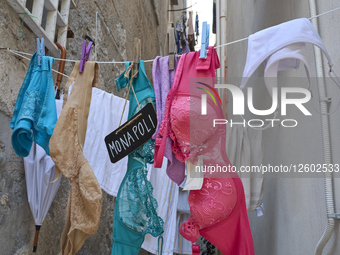 Women’s Underwear Hanging On A Clothesline With A “Monapoli” Sign In Monopoli, Italy