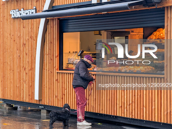 A man wearing a purple cap and red trousers with a black poodle-type dog stands in front of the window of a modern, temporary bakery stand and purchases freshly baked goods and pastries on a rainy day in Munich, Bavaria, Germany, on October 25, 2025.
