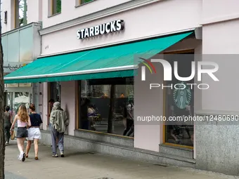 Pedestrians walk past a Starbucks coffee shop with green awnings on a street corner in Vienna, Austria, on June 7, 2025. The international coffee chain's logo is visible on the shop window.
