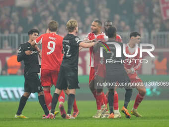 Morten Hjulmand (Sporting CP) and Jonathan Tah (Bayern Munich) battle for the ball during the UEFA Champions league match between FC Bayern Munich and Sporting CP at Allianz arena, Munich, Germany on December 9, 2025.