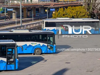 Multiple buses, operated by Trentino Trasporti and featuring a distinct blue and white mountainous livery, are parked at the city bus terminal adjacent to the railway station in Trento, Italy, on November 23, 2025. The bus terminal features covered loading areas, and in the distance, a historic brick tower is visible, highlighting the combination of modern transport infrastructure and historic architecture.