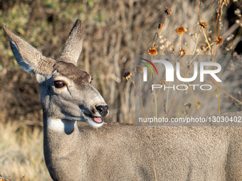 Mule deer are at Bosque del Apache National Wildlife Refuge near San Antonio, New Mexico. Known for their large, mule-like ears, they can rotate them independently to detect sounds from different directions.