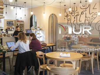 A waiter waits for customers at a cafe where service and the menu are available in Russian, in Novi Sad, Serbia, on February 29, 2024. Such places often attract people working on laptops, as many Russians who have relocated work remotely.