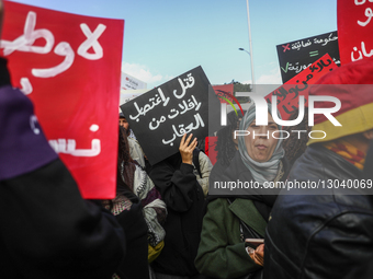 A young feminist activist raises a sign reading in Arabic ''murder, rape, impunity'' during a march organized by feminist groups, including the Tunisian Association of the Democratic Women (ATFD), in Tunis, Tunisia, on November 29, 2025. The demonstration brings together hundreds of human rights defenders, feminist activists, opposition parties, civil society members, and ordinary Tunisians. They denounce what protesters describe as a growing crackdown on freedoms, criminalization of civil society, and restrictions on public space imposed by Tunisian authorities. Participants also condemn the suspension of the activities of dozens of associations and organizations, as well as the rising gender-based violence. They show solidarity with opposition figures recently sentenced on appeal in the ''conspiracy against state security'' case.