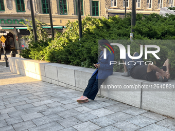 A person is taking an afternoon nap on a park bench at Queens Park in Toronto, Ontario, Canada, on August 14, 2024.