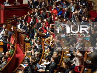 MP deputies of La France Insoumise (LFI) and the Nouveau Front Populaire (NFP) parliamentary group raise their hands to vote on an article of the social security financing bill for 2026, PLFSS 2026, at the National Assembly in Paris, France, on December 9, 2025.