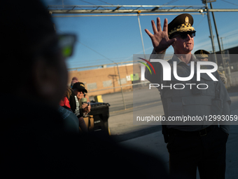A Cook County Sheriff's officer speaks to Rabbi Michael Benyosef during a protest outside of the Broadview Immigration and Customs Enforcement processing and detention facility in Broadview, Illinois on November 15, 2025. The clergyman asked to gain access to the facility to speak with detainees and was granted a phone call to an official inside of the facility to discuss the matter.