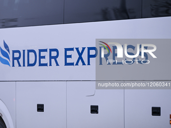 EDMONTON, CANADA - FEBRUARY 15: The Rider Express logo is displayed on the side of a Rider Express bus in Edmonton, Alberta, Canada, on February 15, 2025.