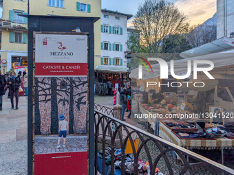 A tall red advertising poster for ''Mezzano Romantica'' is visible next to an open-air market with stalls selling various goods and crafts, located on a cobblestone square near historic buildings in Trento, Trentino, Italy, on November 23, 2025. The market is active with vendors and shoppers, contributing to the daily life scene in the city, which is a host venue and route city for the Olympic Torch Relay scheduled for January 29, 2026, for the Milano Cortina 2026 Winter Olympics.