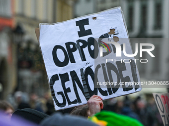 KRAKOW, POLAND – NOVEMBER 29: An activist holds a placard reading 'I Oppose Genocide!' as participants from student, far-left, antifascist, and anarchist groups gather in the Main Market Square during the 'Stop Zabijaniu Polskim Trotylem' ('Stop Killing with Polish TNT') protest, in Krakow, Poland, on November 29, 2025. According to organisers and some media reports, the demonstration was held in response to claims that TNT from the state-owned firm Nitro-Chem may have been used in munitions in Gaza, though these claims have not been independently verified by Polish authorities.
