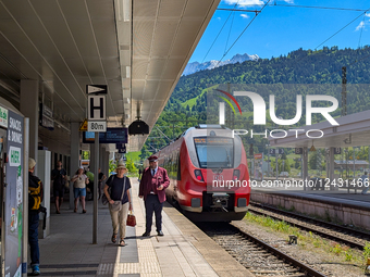 A regional Deutsche Bahn train arrives at Garmisch-Partenkirchen station while a uniformed train attendant stands on the platform to assist passengers in Garmisch-Partenkirchen, Bavaria, Upper Bavaria, Germany, on May 31, 2025. The alpine station serves as a key regional hub for travelers heading into the Bavarian Alps.