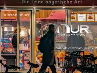 The illuminated storefront of Vinzenzmurr displays meat, sausage products, and sandwich advertisements. A clerk serves a customer inside, while bicycles are parked outside. The store is located in Munich, Bavaria, Germany, on December 5, 2025. Vinzenz Murr Vertriebs GmbH operates a major chain of German butcher shops and snack bars specializing in meat processing, wholesale, and retail food products.