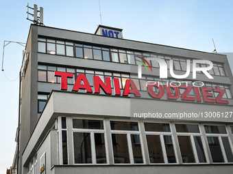 RZESZOW, POLAND – NOVEMBER 19: Advertisement for 'Tania Odziez,' a shop selling inexpensive clothing, in the center of Rzeszow, Poland, on November 19, 2025.