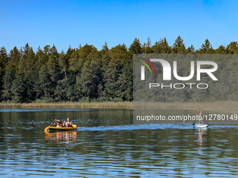 People enjoy an early autumn day with paddling and relaxation at Lake Osterseen in Iffeldorf, Weilheim-Schongau, Bavaria, Germany, on September 21, 2025.