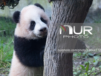 Giant panda cub 'Liangyue' plays at Chongqing Zoo in Chongqing, China, on November 30, 2025.