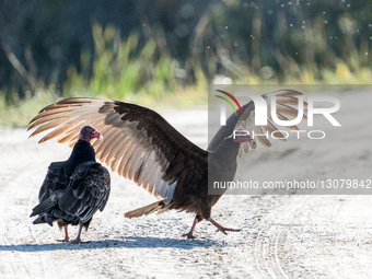Turkey vultures walk along a dirt road at Orlando Wetlands Park in Christmas, Florida, on December 9, 2025. The scavengers play a crucial ecological role by helping prevent the spread of disease through consuming carrion.