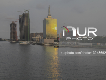 Civic Centre Tower reflects the sunset on the lagoon during the Firewood Jollof Festival 2.0 at Muri Okunola Park in Victoria Island, Lagos, Nigeria, on November 30, 2025.