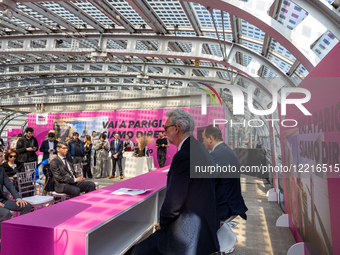 Alberto Cirio, President of Piedmont, stands in front of the SNCF TGV train from Milan to Paris at the Porta Susa railway station in Turin, Italy, on March 31, 2025. Rail traffic on the Frejus international railway line resumes after being partially interrupted since late August 2023 due to a landslide in a section of France just a few kilometers from the Italian border.