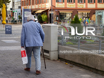 A senior citizen carries a shopping bag and walks with a cane in the town center of Schwabach, Franconia, Middle Franconia, Bavaria, Germany, on October 18, 2025.