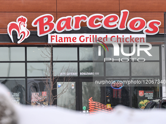 EDMONTON, CANADA - FEBRUARY 15: The Barcelos logo is displayed on the storefront of a Barcelos Flame Grilled Chicken restaurant in Edmonton, Alberta, Canada, on February 15, 2025.