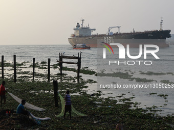 Fishermen arrange fishing nets as the Oil Products Tanker Willows moves in the Arabian Sea in Kochi, India, on December 2, 2025