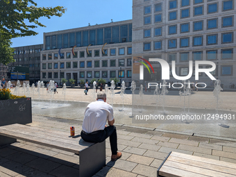 A senior man sits on a bench beside a fountain to rest and cool off in Stuttgart, Baden-Wuerttemberg, Germany, on June 20, 2025. The warm weather and sunshine draw people to water features for relief from the summer heat.