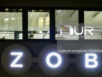 The illuminated ZOB sign is displayed on the building of the Central Bus Station (ZOB) at night in Munich, Bavaria, Germany, on October 30, 2025. The ZOB serves as a major hub for intercity and long-distance buses in the city.