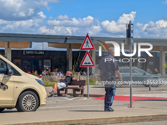 A police officer patrols at the Airport Service Center in Memmingen, Swabia, Lower Allgaeu, Allgaeu, Germany, on July 12, 2025. The Airport Service Center houses the information desk, the ALLgate ticket counter, the car hire providers, the TUI Travel Centre, and a Coffee Fellows Express Bar.